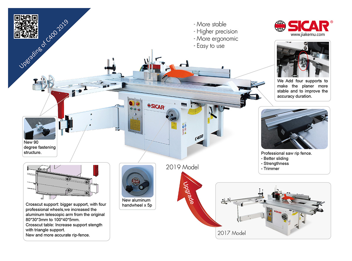 The C400 Combined Machine has been specifically designed be an industrial standard machine, but at a size intended for the factory and small professional workshop. This industrially rated machine features a table saw and sliding table, planer, thicknesser and spindle moulder unit. The cast iron construction, accurate cross cut fence and superb build quality put this machine in a class of its own.